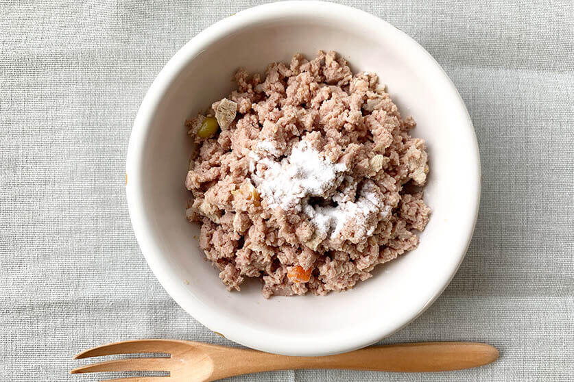 一カ所に固まってしまわないよう、粉薬は全体にふりかけて、よく混ぜてから与えてください。