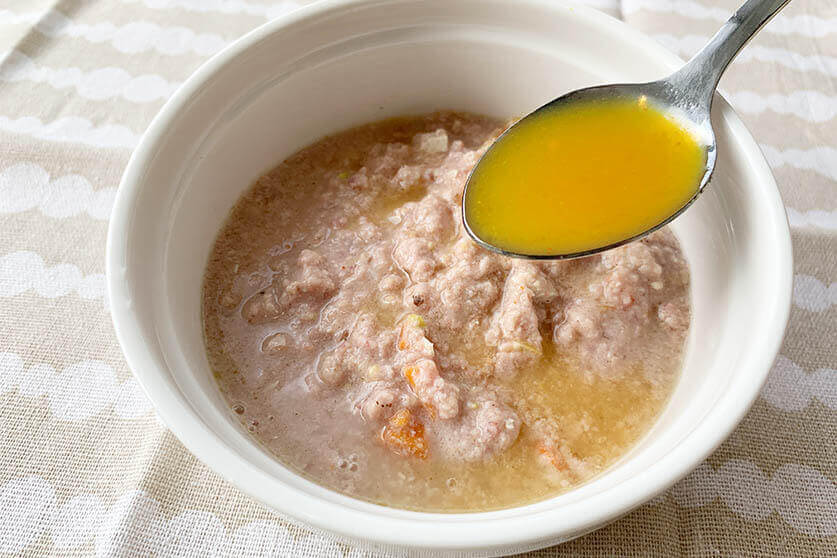 シロップ剤には独特な甘い匂いがついているので、警戒するワンちゃんには、お湯の代わりにヤギミルクやお肉の茹で汁、お魚のお出汁などを入れてあげると、より食べやすくなりますよ!