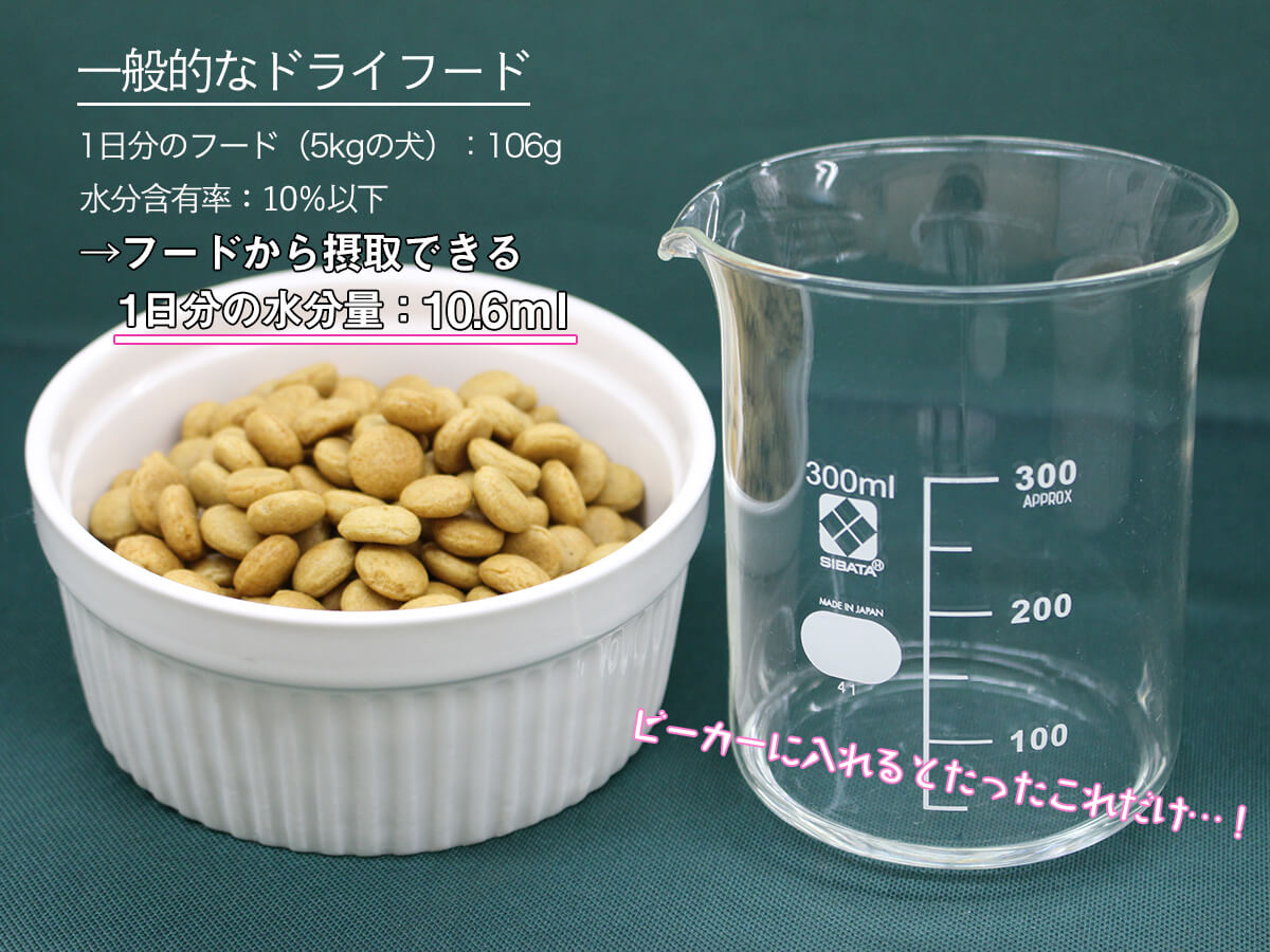 一方、ドライフードのみの食事だと、食事の他にコップ1杯以上の飲み水が必要になります。