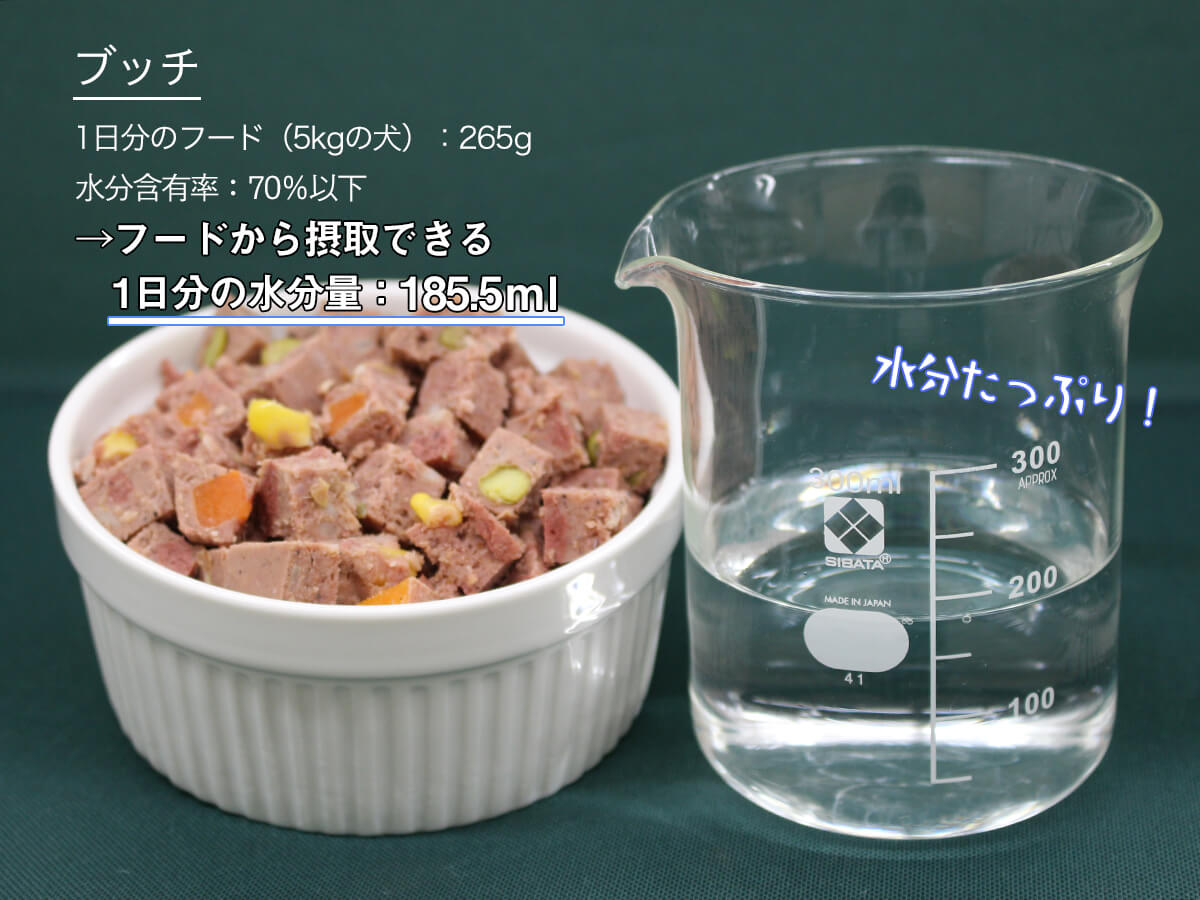 でも具体的にブッチの水分量ってどれくらいなんだろう・・・?と思い、含まれる水分量を可視化して一般的なドライフードと比較してみました(^^)